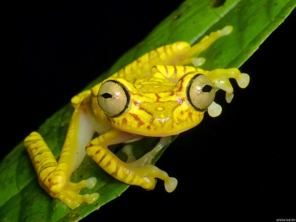large eyes and appears to be in an aquatic or semi-aquatic habitat due to its presence on what looks like a leaf or floating plant. This frog likely feeds on insects found in such environments.