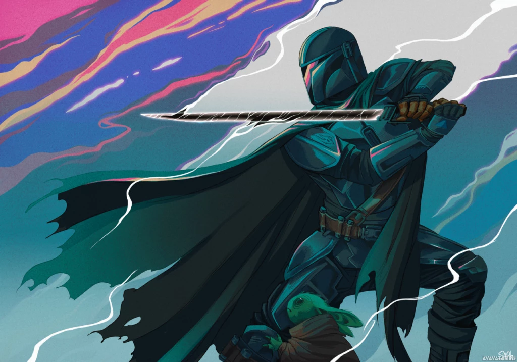 На картинке изображен персонаж, похожий на мандалорца из франшизы "Звездные войны". Он держит меч, а стиль рисунка позволяет предположить, что он может быть вдохновлен вселенной "Звездных войн" или связан с ней.