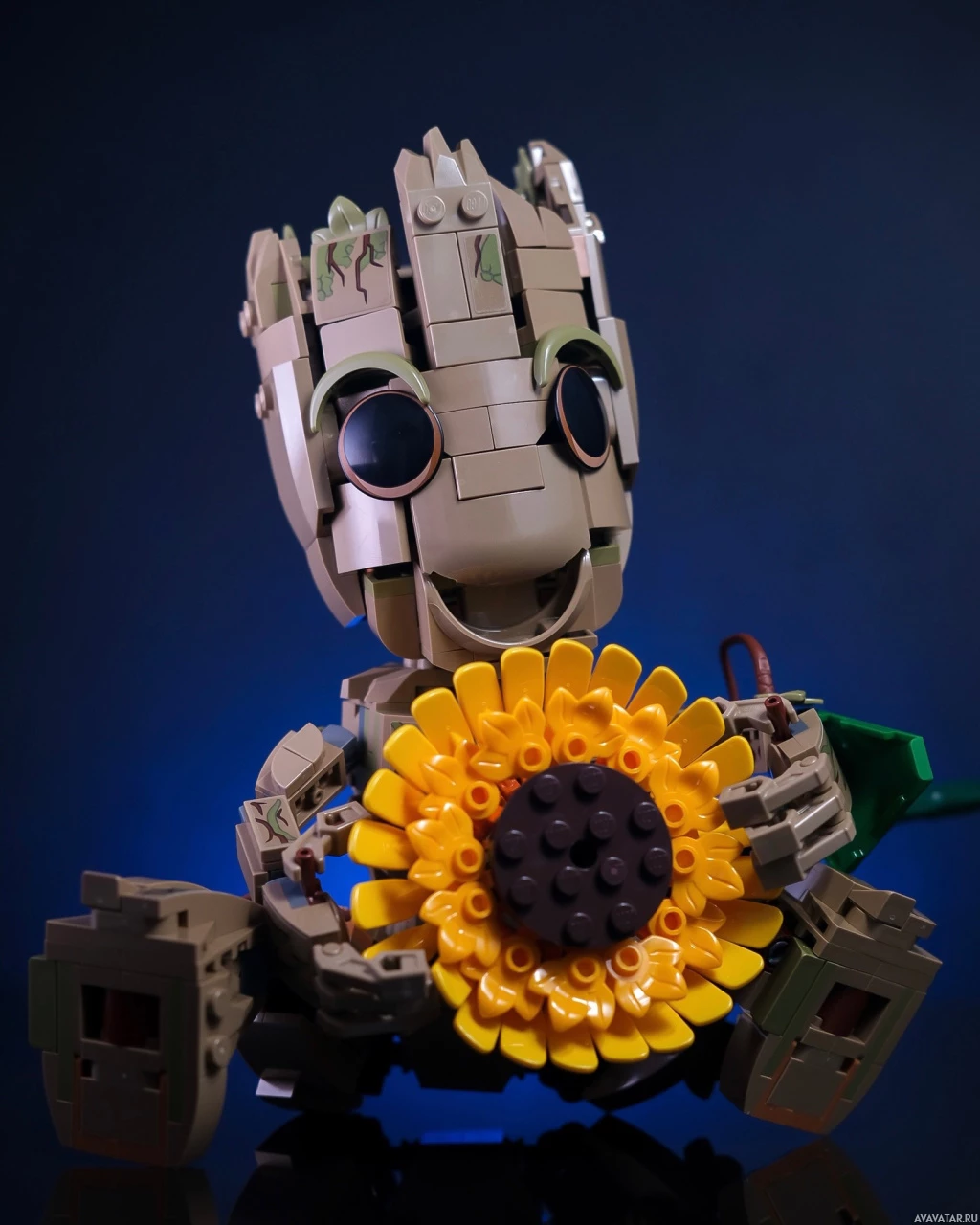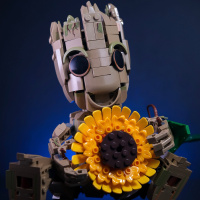 a LEGO figure representing Groot, the character known for saying "I am Groot" from the Marvel movies. The LEGO figure is depicted holding what appears to be a flower, specifically a sunflower. The figure is sitting on a surface with