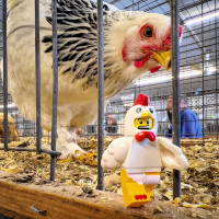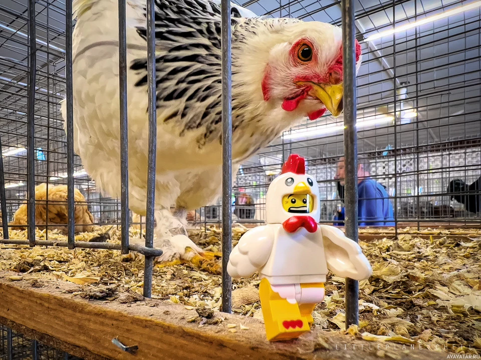 a Lego figure that resembles a chicken, placed on what looks like a piece of wood or ground surface outside the enclosure. This creates a humorous comparison between the actual bird inside the cage and the toy representation of it outside. The image does not contain any people or other animals.