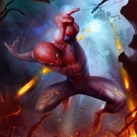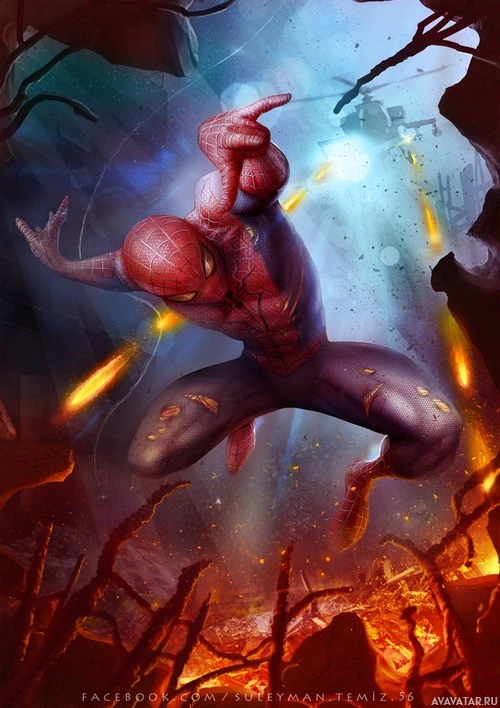 Marvel comics. He is shown in his iconic red and blue suit, with spider web