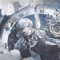 The image features an animated character with white hair. She is depicted in a fantastical setting that includes a clock as a prominent element, suggesting a theme of time or the passage of time within the context of her narrative. The artwork has elements of anime styling and seems to be related to a specific genre or series known for incorporating such themes and visual styles.