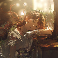 The image depicts a character who appears to be from an anime or manga, set in a forest-like environment. The character is shown with long hair and what seems to be a contemplative expression while sitting on a fallen tree branch. The artwork has a fantasy or magical vibe due to the soft lighting and ethereal atmosphere.