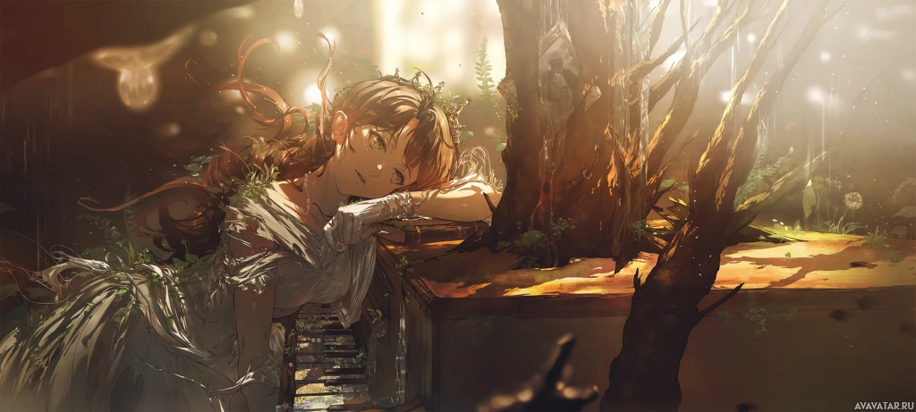На картинке изображен персонаж, который, по-видимому, из аниме или манги, действие которого происходит в лесу. Персонаж изображен с длинными волосами и задумчивым выражением лица, сидящим на упавшей ветке дерева. Благодаря мягкому освещению и неземной атмосфере, произведение искусства обладает фантастической или волшебной атмосферой.