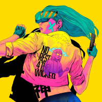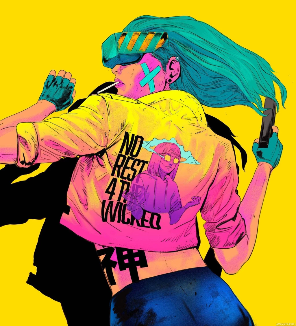 long hair and is holding what looks like a gun in her right hand, which suggests she might be engaging in combat within the game's setting. The illustration captures a moment that could represent action or adventure typical of a cyberpunk