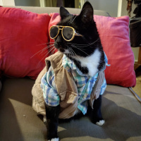 The picture shows a cat wearing sunglasses and clothes. It appears to be dressed up in human-like clothing, including a vest, shirt, and possibly pants or shorts. This could be considered a whimsical or humorous arrangement of attire for a pet.