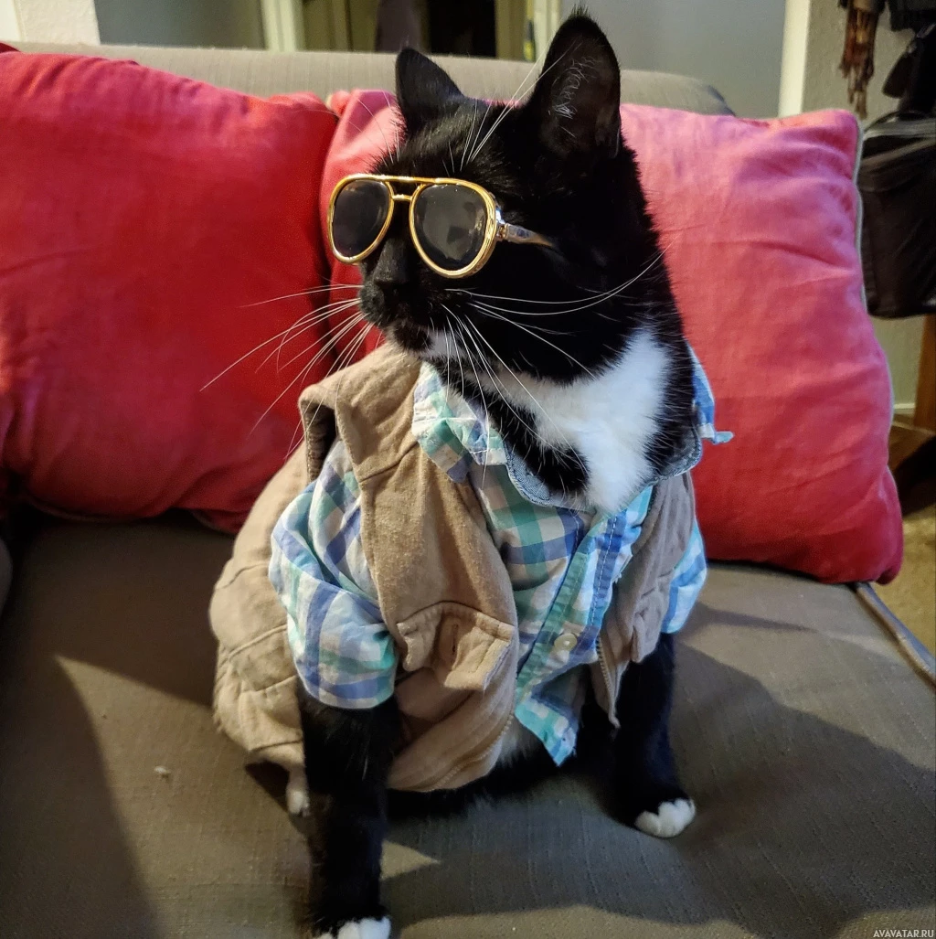 На картинке изображен кот в солнцезащитных очках и одежде. Кажется, что он одет в одежду, похожую на человеческую, включая жилет, рубашку и, возможно, брюки или шортики. Это можно рассматривать как причудливый или юмористический вариант одежды для домашнего животного.