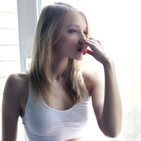 На картинке изображена молодая женщина, сидящая у окна в спортивном лифчике и леггинсах. Кажется, что она смотрит в окно или на что-то за кадром с задумчивым выражением лица.