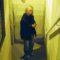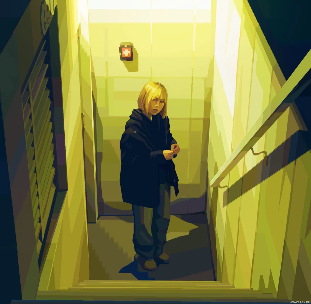 a light source coming from the top of the stairwell, illuminating her figure and casting shadows on the wall behind her. The atmosphere of the image seems somewhat melancholic or contemplative due to