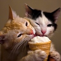 an ice cream cone, which is placed on a surface in front of them. Both cats have their paws outstretched towards the ice cream, suggesting that they might be trying to interact with or claim the treat for themselves. This scene could also suggest a playful and light-