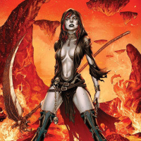 a fantasy character, who appears to be a female warrior or demoness. She is depicted in a dynamic and intense pose, with flames and lava surrounding her, suggesting she may be associated with fire or destruction. Her attire includes a hood that obscures part of her head, giving her an intimidating and mysterious appearance. The character is holding what looks like a trident or spear in one hand, which is commonly used as a weapon in