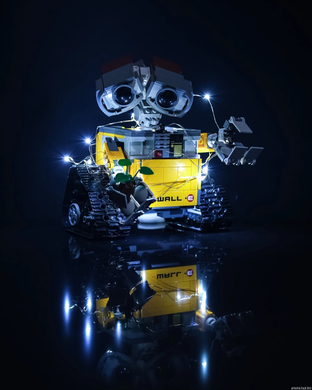 На картинке изображена фигурка робота, которая основана на дизайне УОЛЛ-И из анимационного фильма "УОЛЛ-И". Эта фигурка была создана из кирпичиков Lego и компонентов, представляющих персонажа. Это креативное решение, в котором элементы конструктора Lego сочетаются с культовым дизайном WALL-E.