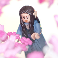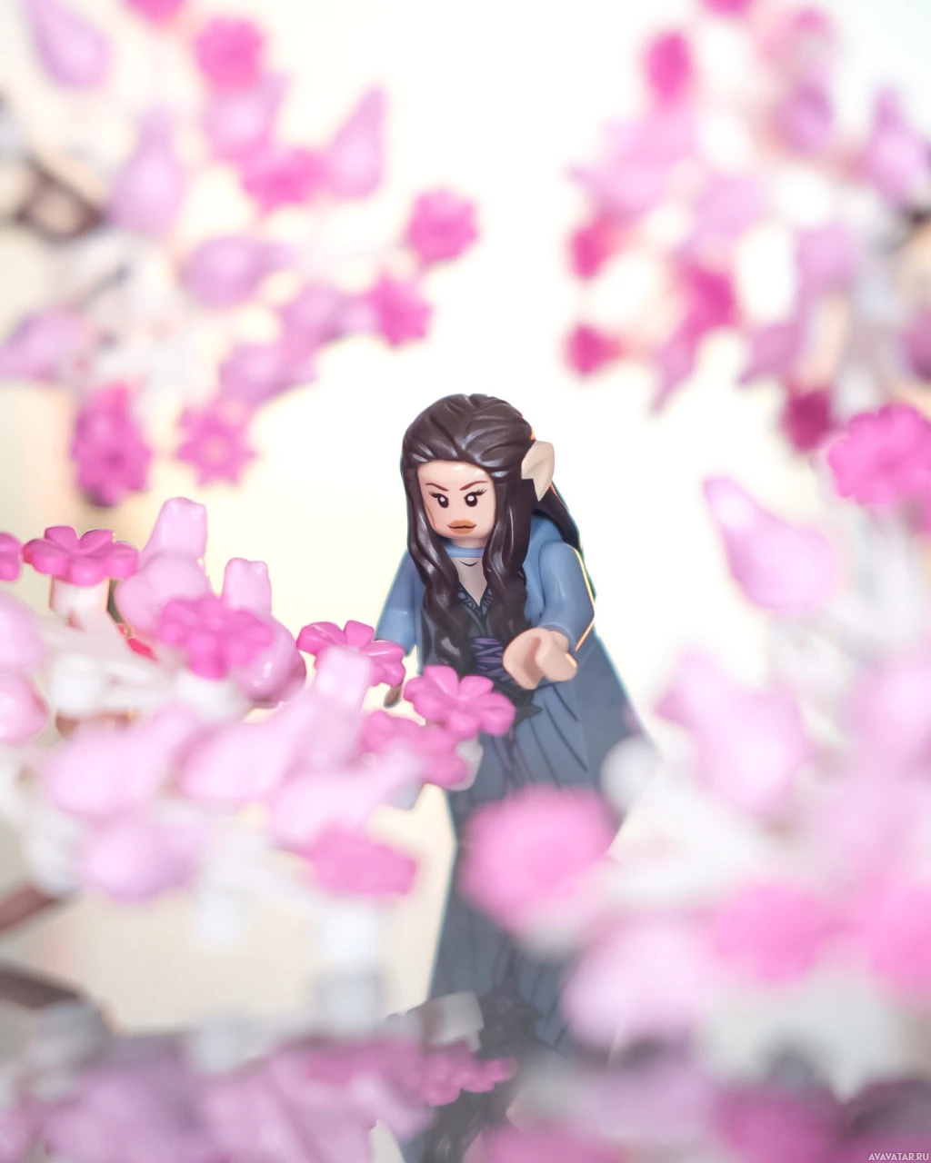 На картинке изображена фигурка Арвен, персонажа из вселенной "Властелина колец", изготовленная из конструктора Lego. Она протягивает руку к цветку, что напоминает обстановку Средиземья. На заднем плане изображены розовые цветы, напоминающие о цветении сакуры, которые в популярной культуре часто ассоциируются с весной и новыми начинаниями. Изображение было отредактировано или скомпоновано таким образом, чтобы акцентировать внимание на фигурке Lego на цветочном фоне.