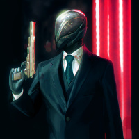 an interior space with a neon light-filled background that suggests a futuristic or science fiction theme. The use of red in the mask and the environment gives the image a vibrant,