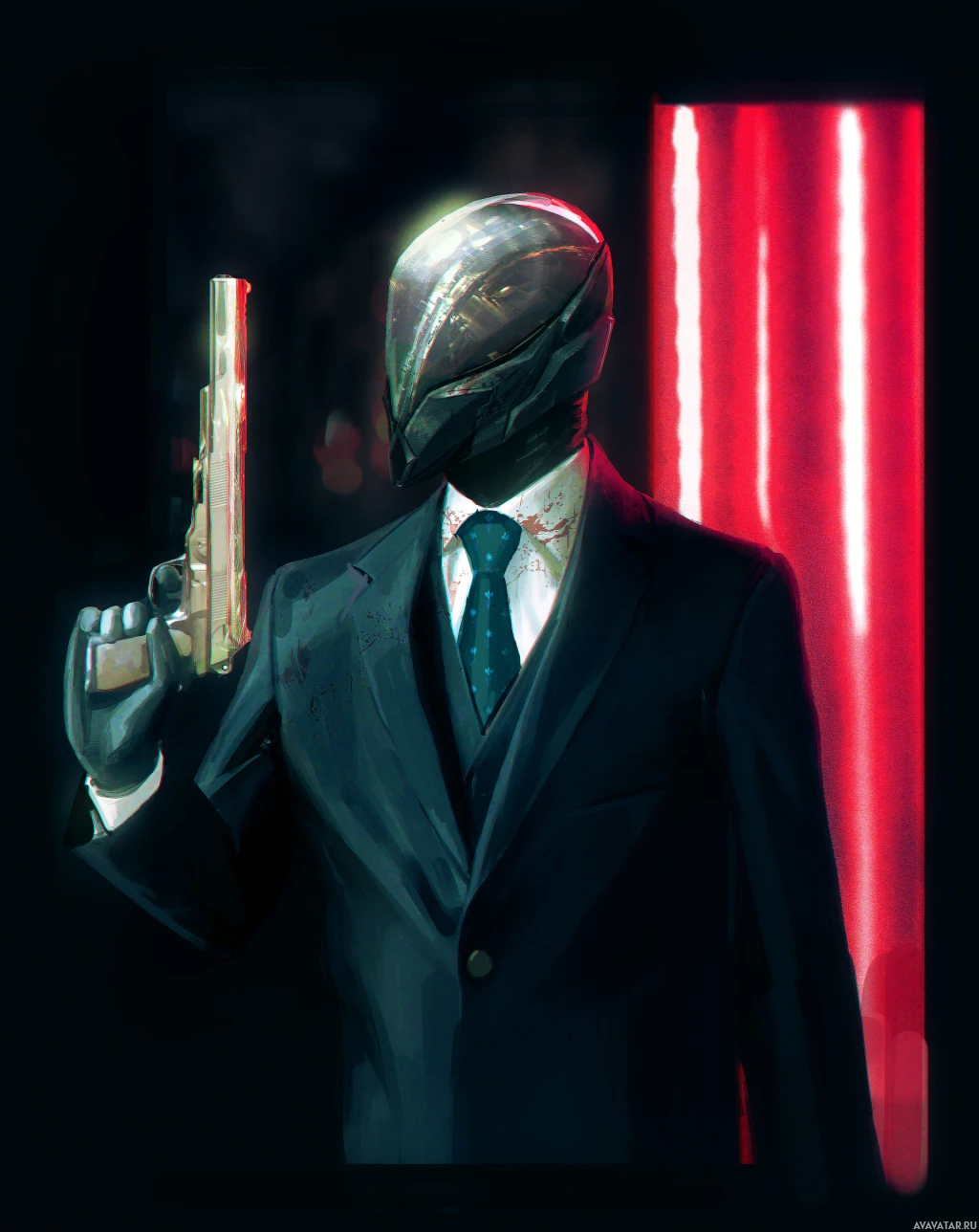 an animated character dressed in a formal suit, wearing a mask with what appears to be a red substance or liquid coming out of the eye holes. This character is holding a pistol and pointing it towards the viewer. The setting seems to be