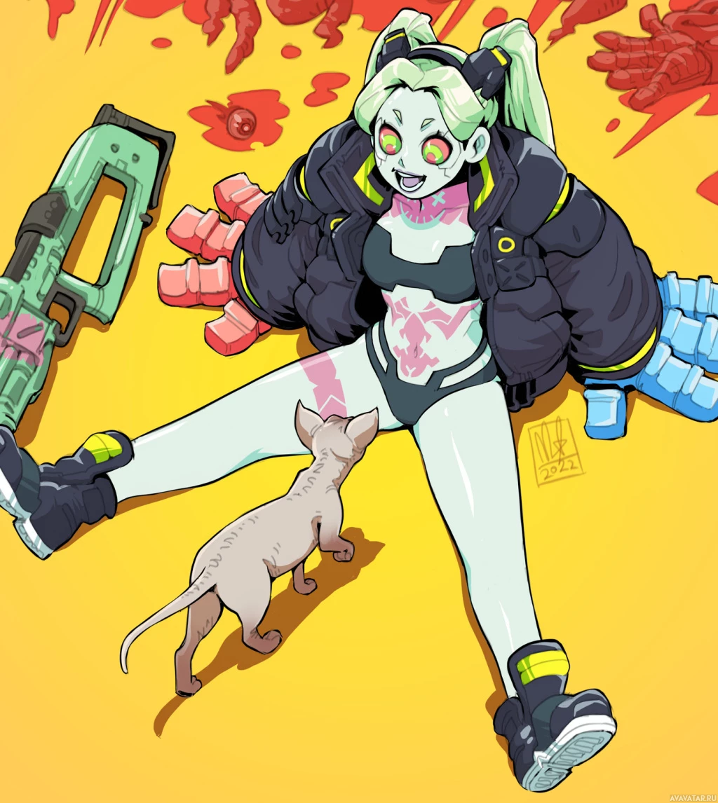 futuristic armor and carrying a weapon. Next to her is a cat, which she seems to be petting or playing with. The background includes bloody imagery reminiscent of the chaotic world of "Cyberpunk 2077," and there are references to the game's aesthetic, such as
