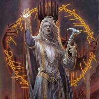 dark attire and a menacing expression, holding what seems to be a ring or other symbolic item in one hand. The background features what looks like runes or inscriptions, adding to the mystical and fantastical theme of the artwork. Please note that this description does not include any personal