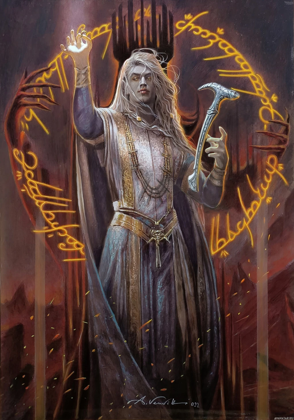 The image shows an artistic illustration of a figure that appears to be inspired by Middle-earth mythology, specifically reminiscent of Sauron. This character is depicted with