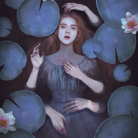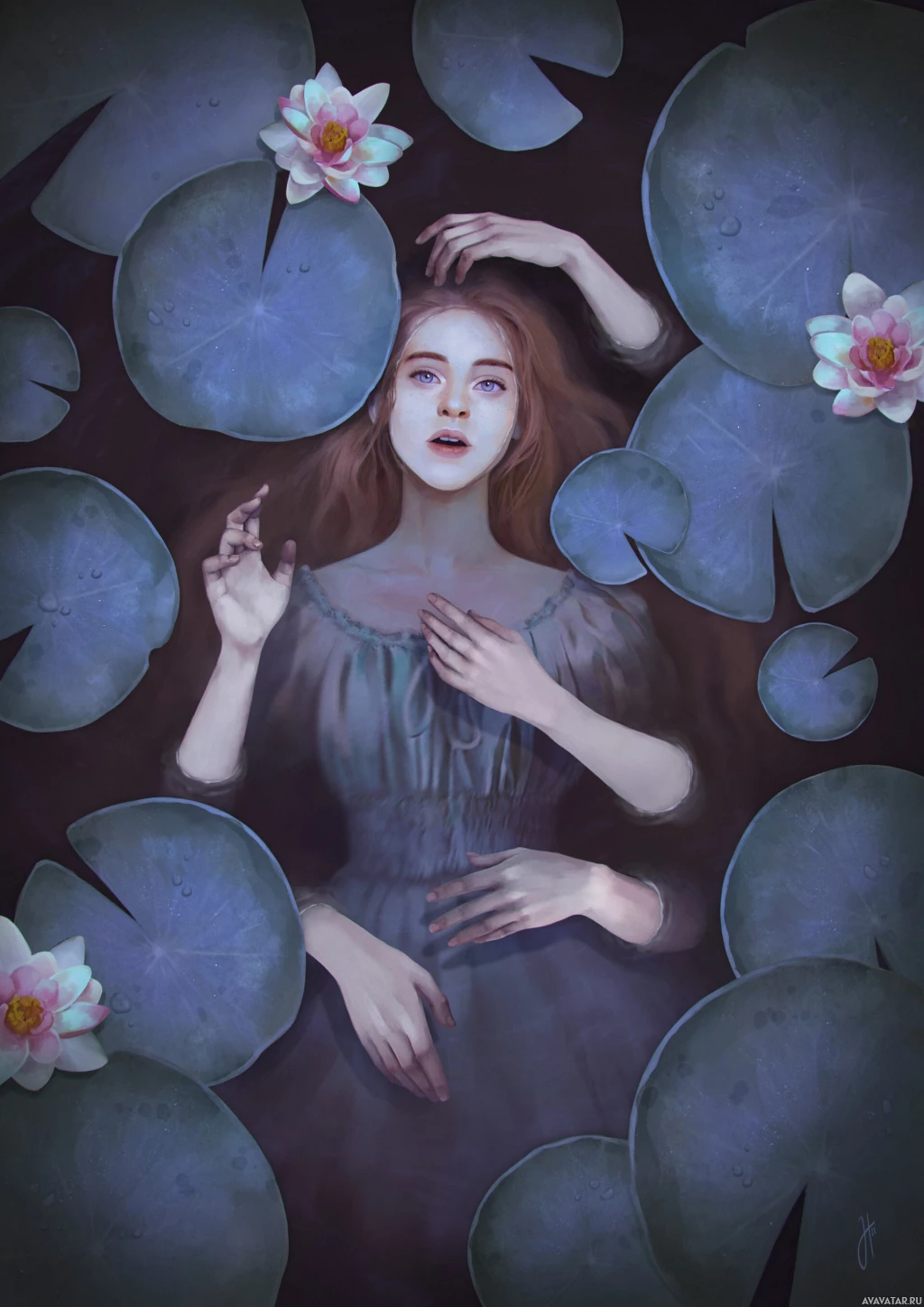 lily pads. Her hands are raised as if she is touching the water or reaching for something above it. She has