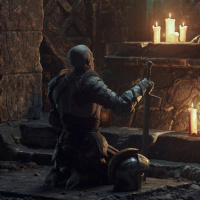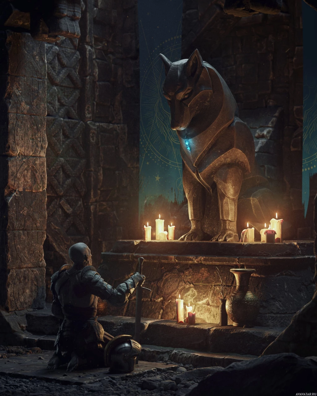 an ancient temple or ruins, possibly influenced by Norse mythology given the style of the architecture and the presence of the wolf motif which is significant in Norse folklore. Behind this figure stands another character who seems to be observing the scene from a higher position. This image captures a moment that suggests interaction with the game's world, possibly indicating a narrative point or