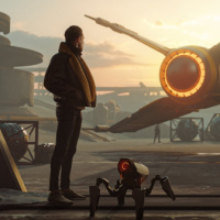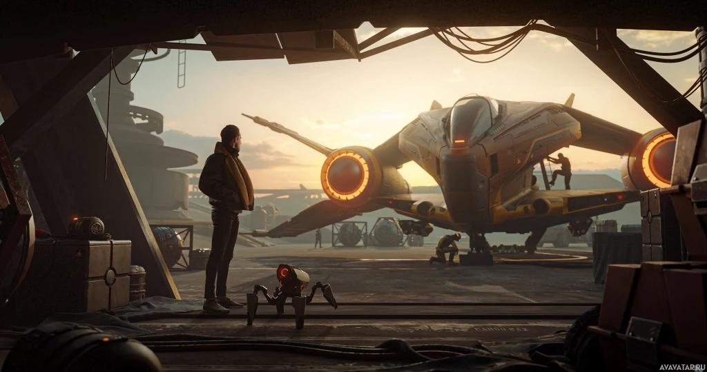role in the story or setting, possibly as part of a crew, maintenance, or security personnel. The overall atmosphere is one of anticipation or preparation for a mission or departure.