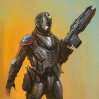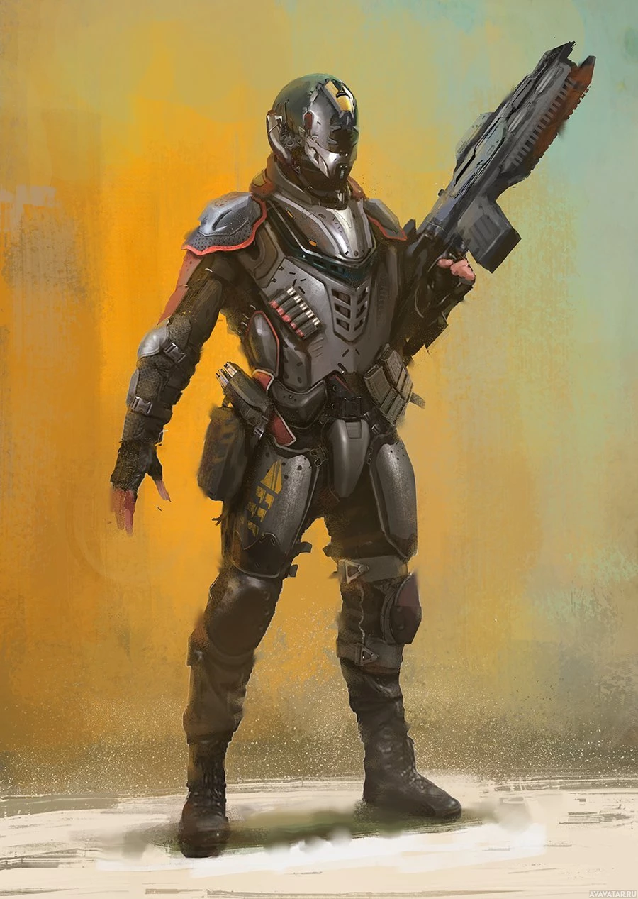 a science fiction setting, dressed in futuristic armor with various pieces that look like they could serve different functions. This includes a helmet that covers the head and possibly provides