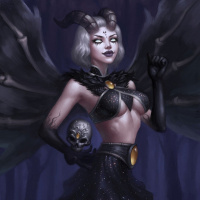 white hair, dark eyes, pointed ears, wings, and horns, which are typical features of depictions of succubi. The attire of the character suggests a demonic or wicked aesthetic with
