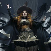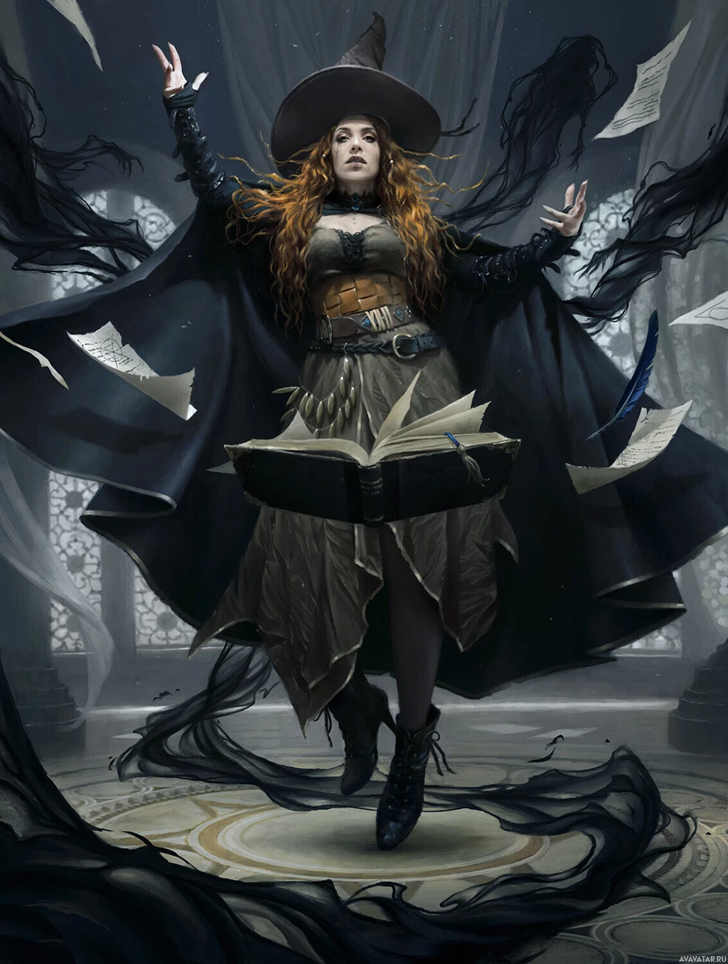 a black robe with flowing sleeves and has a hat that resembles a witch's traditional conical hat. They are holding what appears to be a tome or book in one hand, which could symbolize knowledge or magic, and they have the other arm outstretched towards what looks like