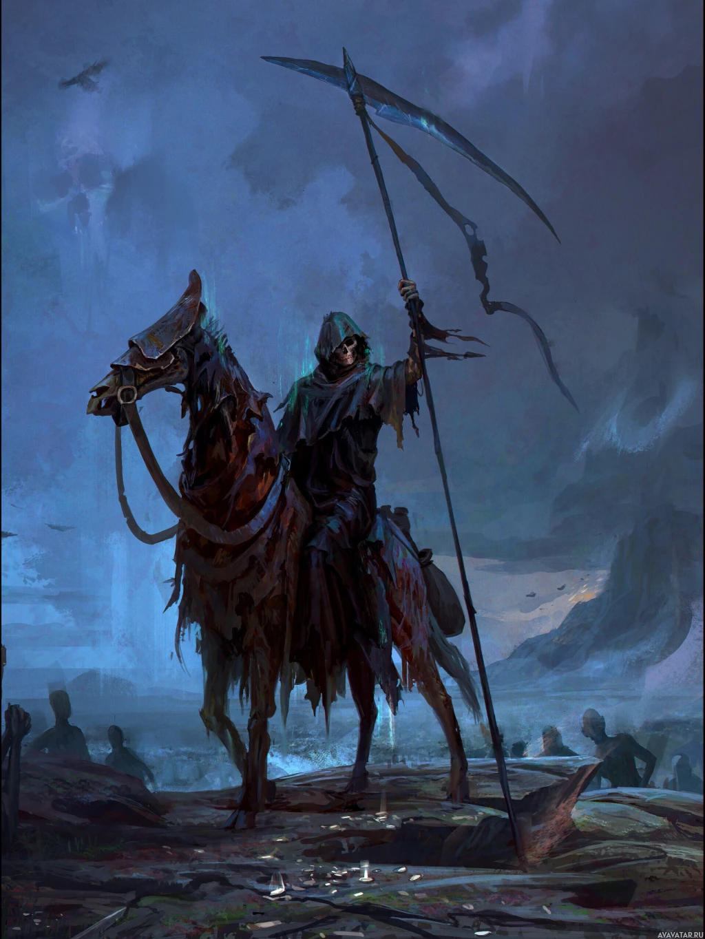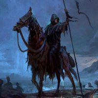 figures in the background that might represent soldiers or victims of war. The overall atmosphere suggests a scene from a medieval or fantasy setting where death is present.