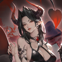 The image features a stylized character that appears to be a fantasy-themed succubus. She has red horns and is dressed in a black, form-fitting outfit with
