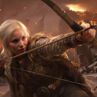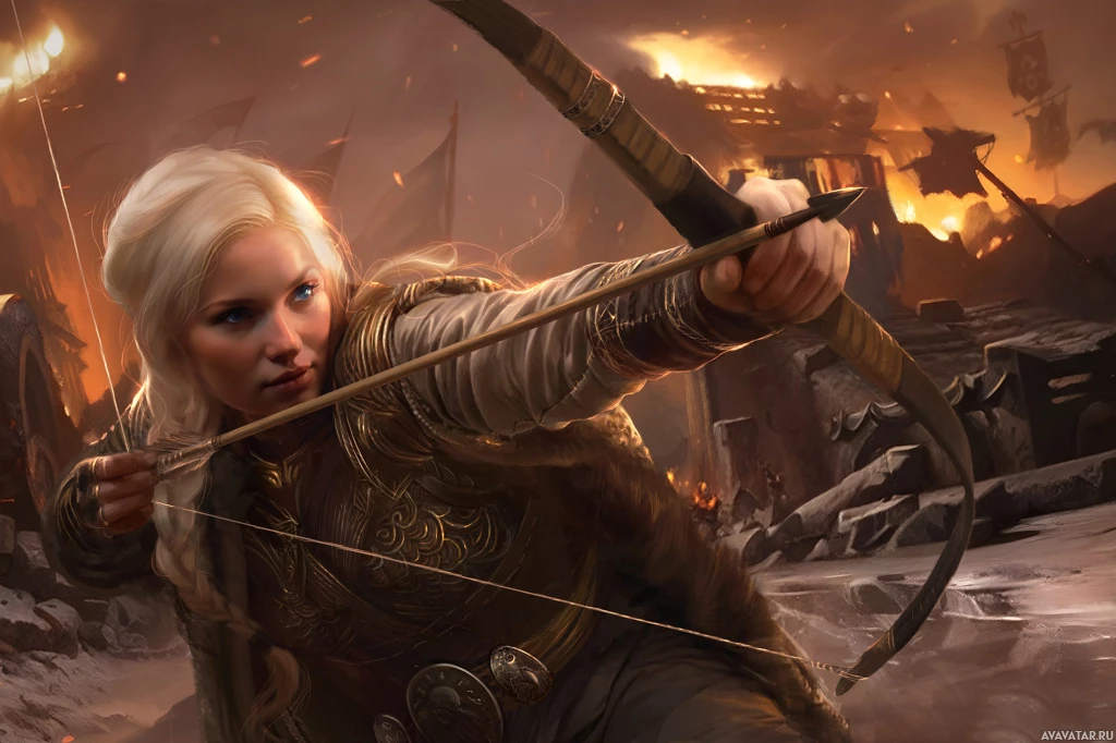 a fantasy setting, possibly inspired by Norse or Viking mythology, given the style of armor and the landscape around her. The character is shown with determination and focus as she draws back her arrow. The scene suggests