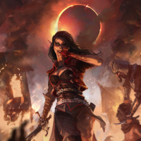 female character, known as a drow in the fantasy genre. She is armed and armored, standing amidst chaos and destruction, possibly indicating a battle or