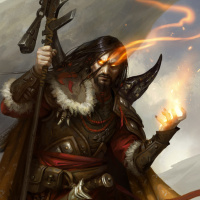 a magical staff or wand. The background suggests a rugged,