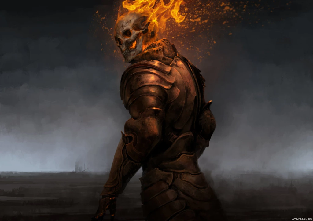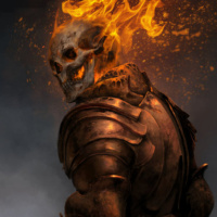 a flame on top, suggesting a fiery or infernal theme. The background has a dark and moody atmosphere, contributing to the fantasy-themed setting. This type of imagery could be associated with characters from