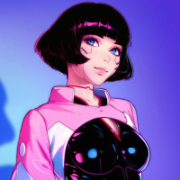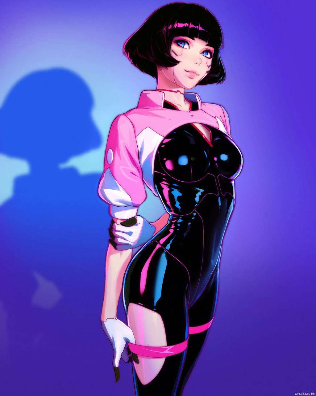 an animated character with short brown hair, wearing a black and pink outfit that could be interpreted as a bodysuit or jumpsuit. She has