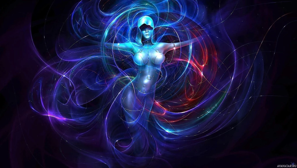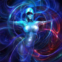 This is an artistic image featuring a fantasy-themed character. The central figure appears to be a humanoid with glowing blue and purple energy or light emanating from its hands, suggesting magical or mystical powers. The background consists of swirling patterns and colors that seem to represent energy or vortexes, which add to the fantastical