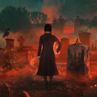 supernatural figure. She is standing on a graveyard filled with tombstones and surrounded by trees and fog. A