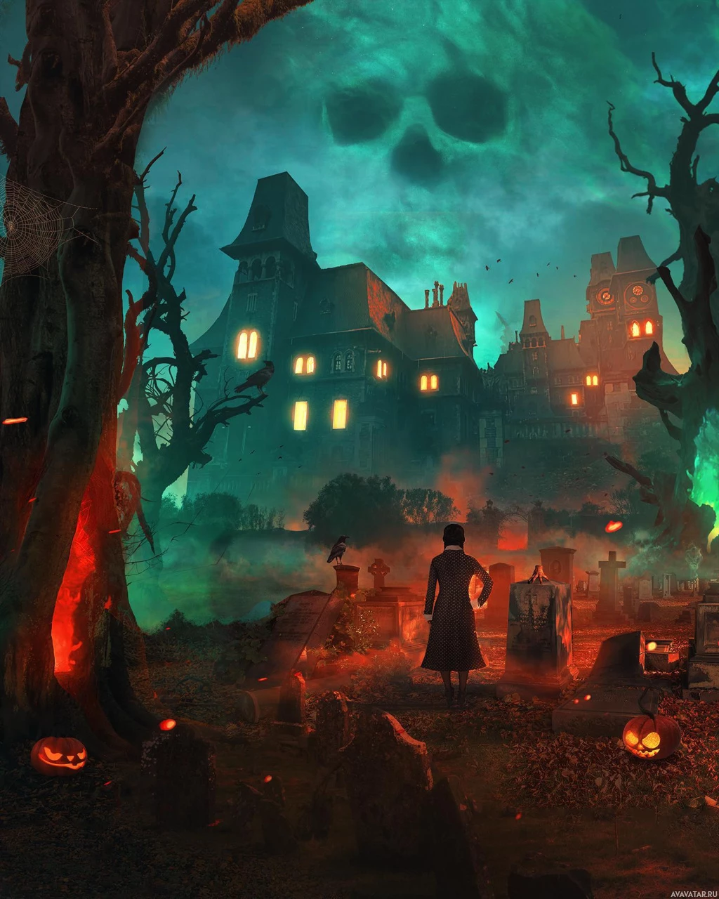 The image depicts a Halloween scene with