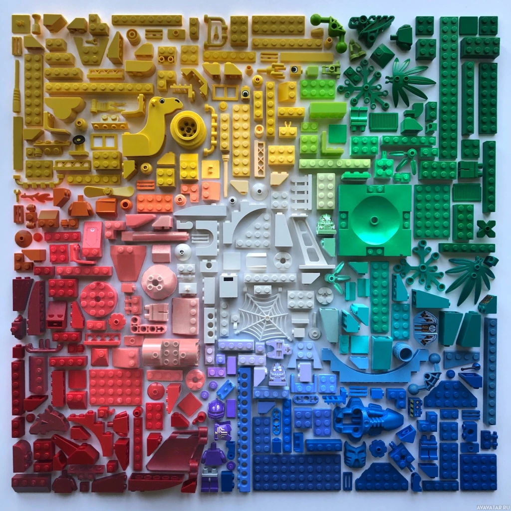 Lego bricks arranged in a way that they resemble various objects and scenes. There are no specific texts or branding visible on the Lego pieces themselves, but their arrangement suggests