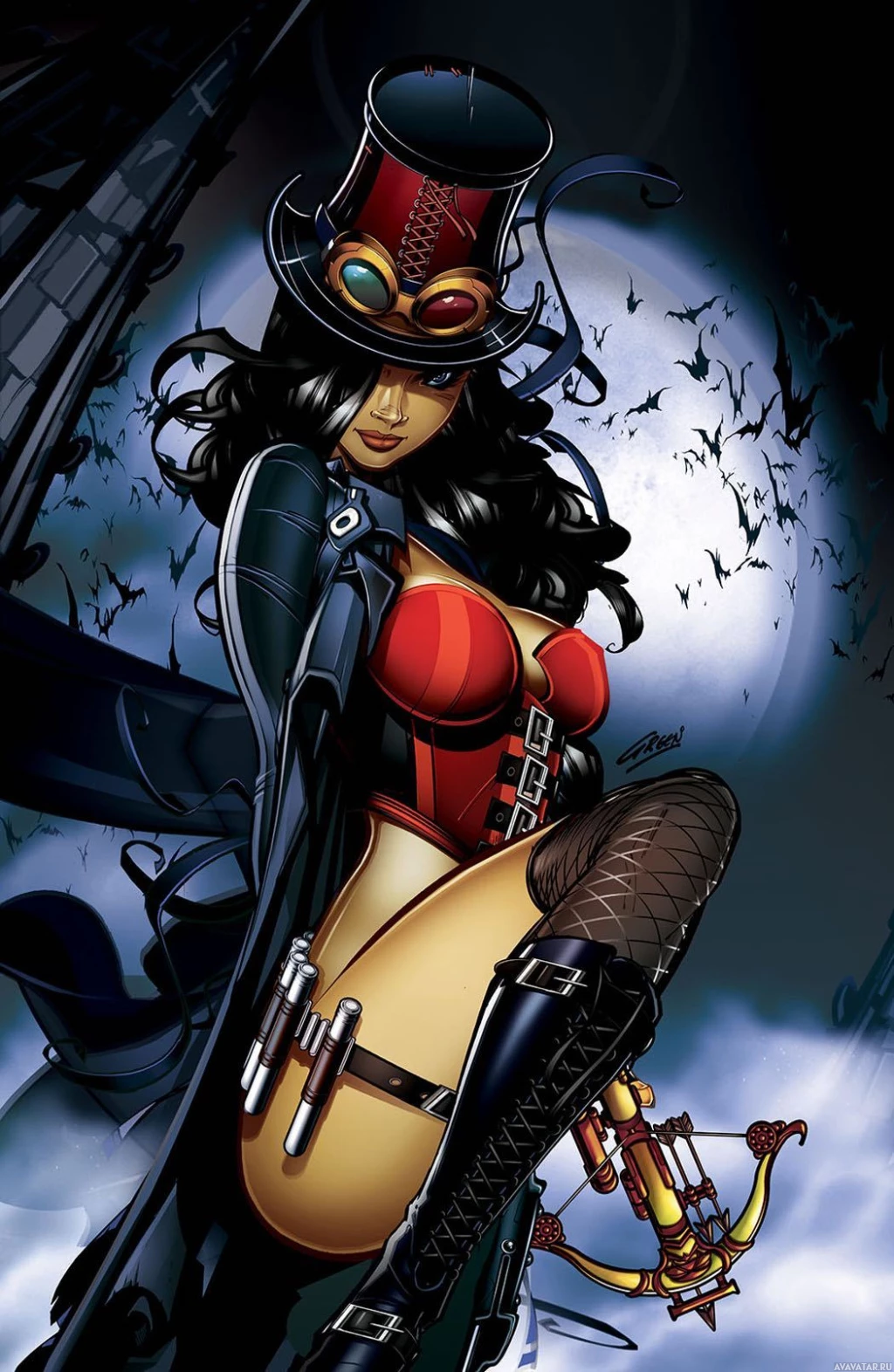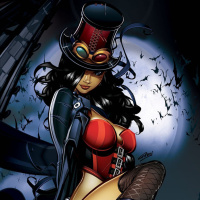 a top hat with goggles on it, suggesting an adventurous or fantasy theme. The background includes elements of machinery and pipes, which could indicate that she is in some sort of industrial or sci-fi setting. There are also bat-like creatures flying around, adding to the dark and