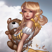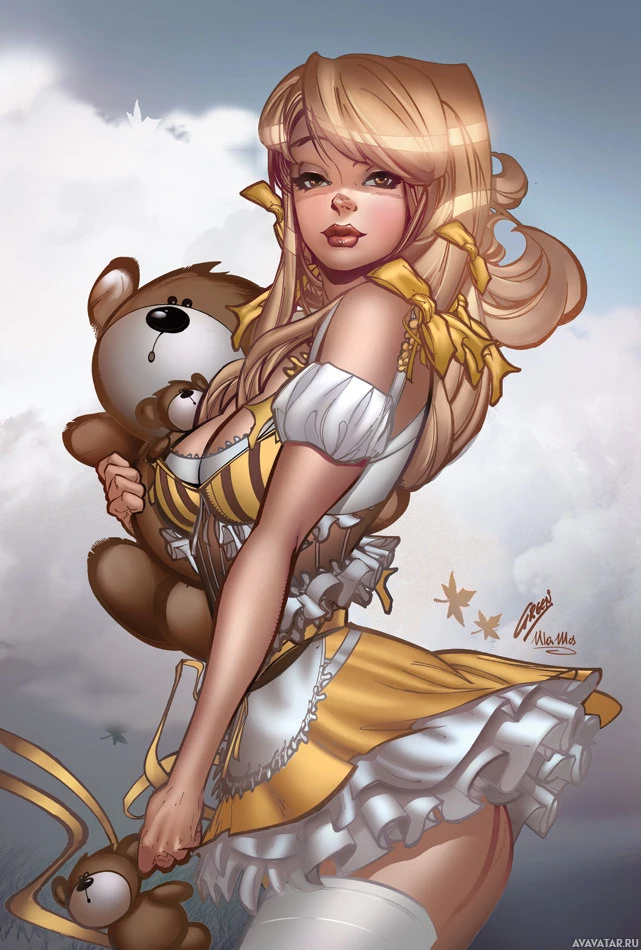 teddy bear in one arm. Her posture suggests she is playful or whimsical, and the overall style of the drawing is detailed and colorful.