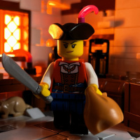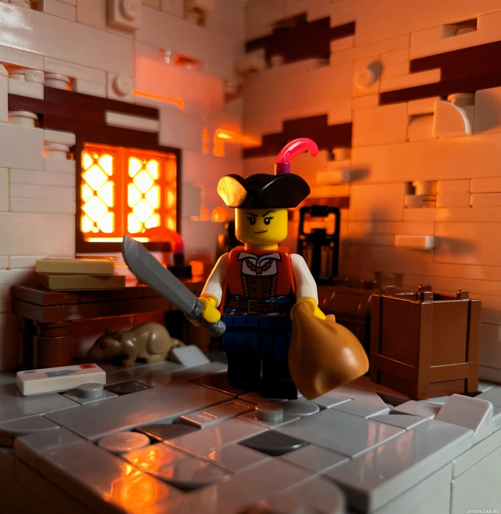 a Lego figurine dressed as a pirate, holding a sword. It appears to be set in a Lego