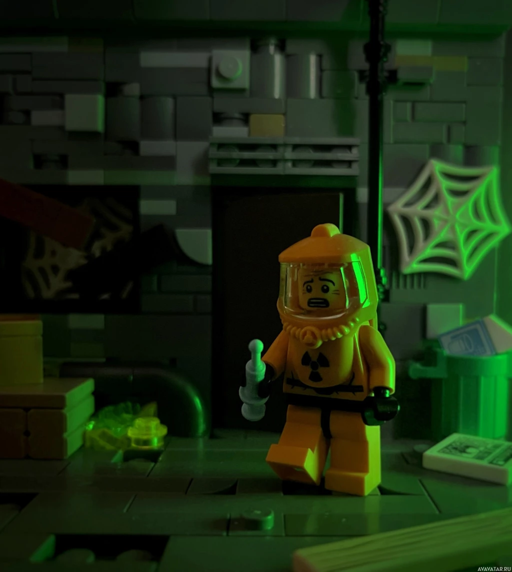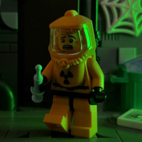 a Lego figure dressed as a hazmat suit with the text "RADIATION" on it. This character is standing in an environment that resembles