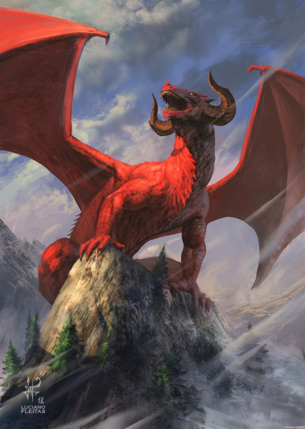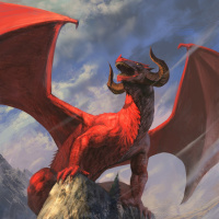 a fantastical scene featuring a red dragon. The dragon is shown in a majestic pose, sitting atop