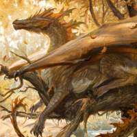 large wings, scales, and a prominent spine running down its back. It's sitting among what appears to be autumn foliage, with trees adorned with leaves that have turned colors typical of fall season, such as yellows and browns, interspersed with