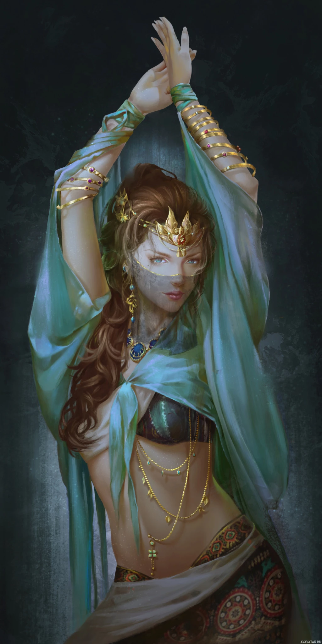 flowing hair, ornate jewelry, and is holding her arms outstretched with one hand on her hip. The background suggests a dark,
