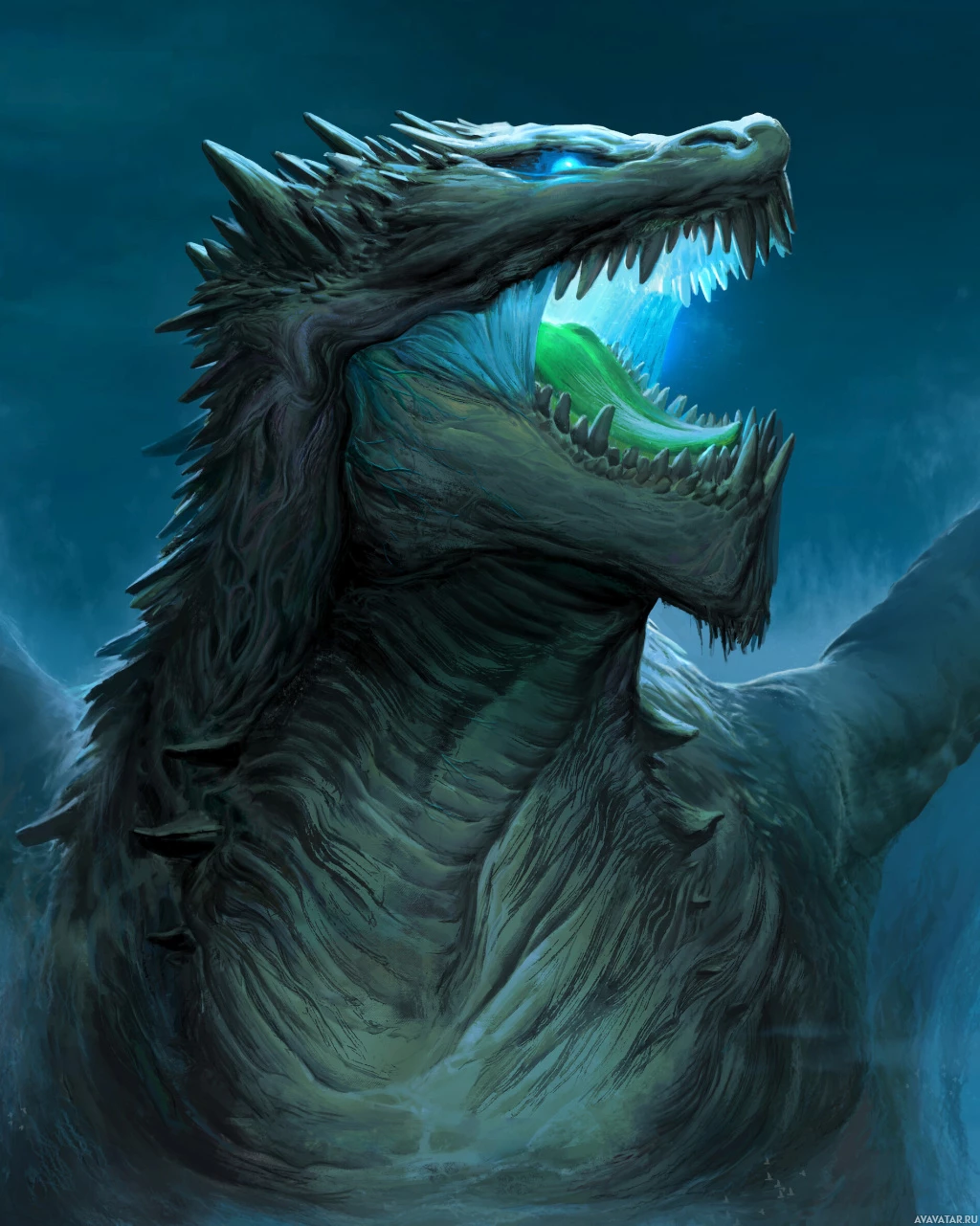 The image shows a fantasy representation of Godzilla, depicted as a dragon-like creature with its mouth open, revealing