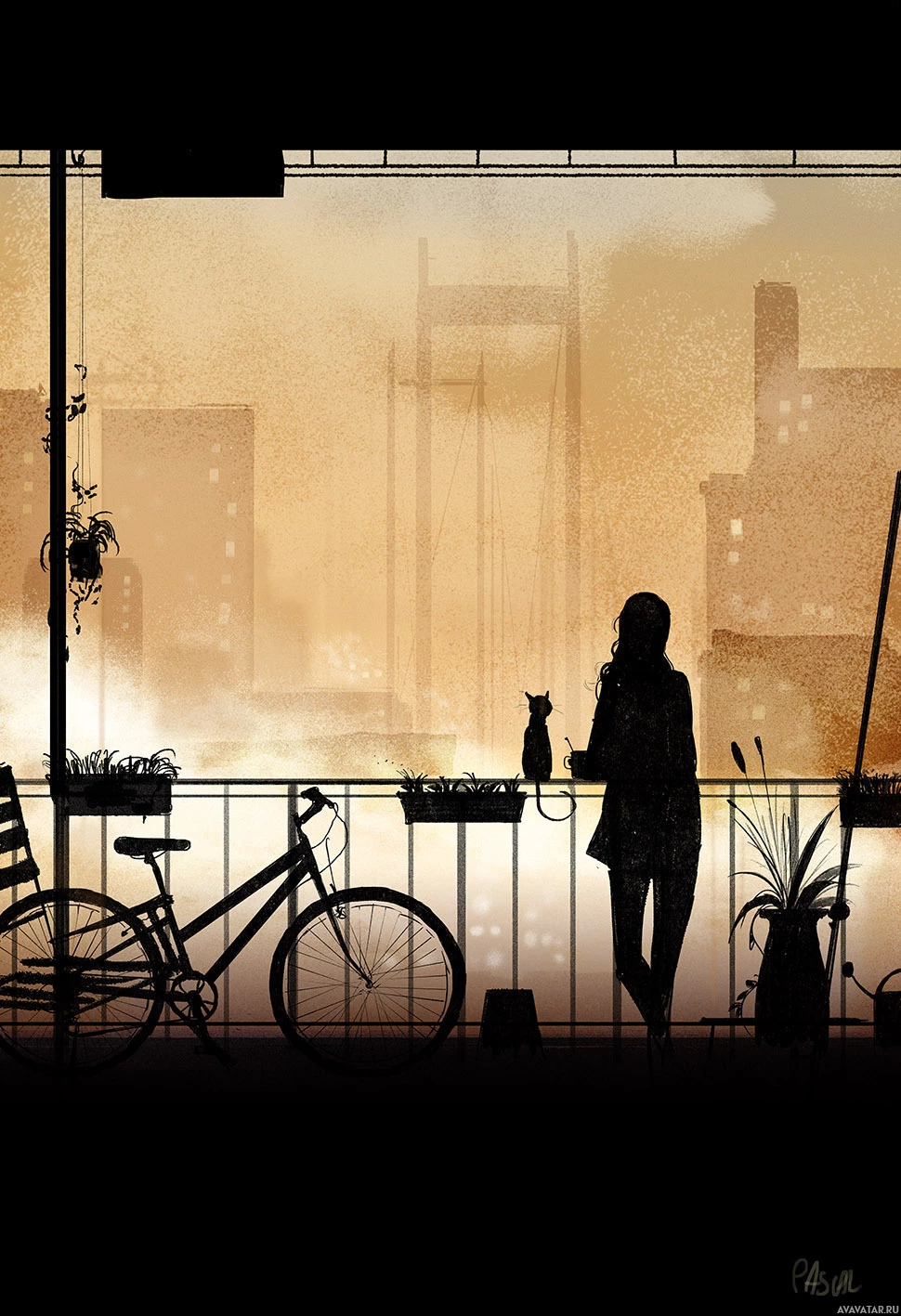 a silhouette of a woman sitting at an outdoor table. There is also a cat standing on the table next to her. In front of them, there's a bicycle leaning against the railing of what appears to be a balcony or terrace. The scene suggests a calm and quiet evening in