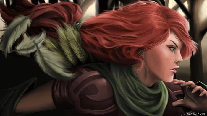 На картинке изображен персонаж из видеоигры Dota 2, известной как Windranger. Она изображена с рыжими волосами, в зеленом наряде, и имеет лук в руке. Фон предполагает лесную обстановку.