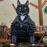 The image shows a cat wearing a costume that resembles the armor from "The Witcher"